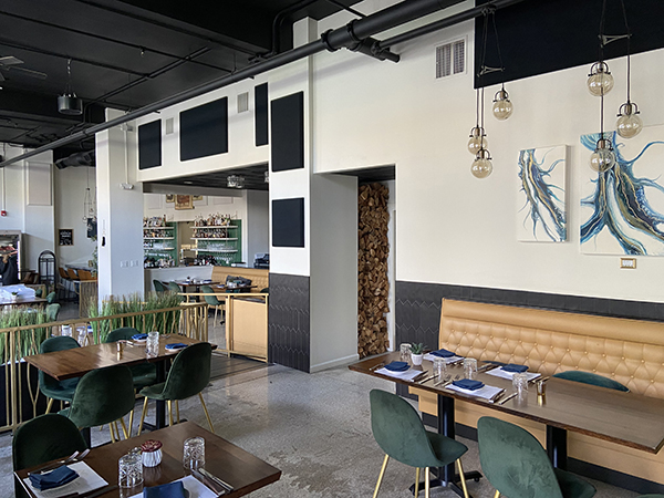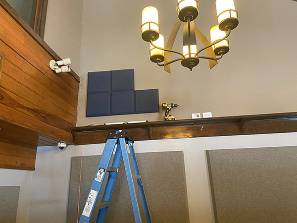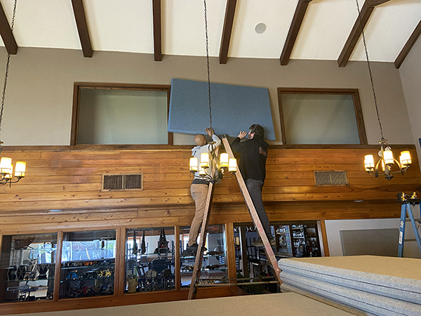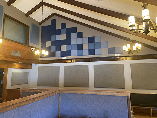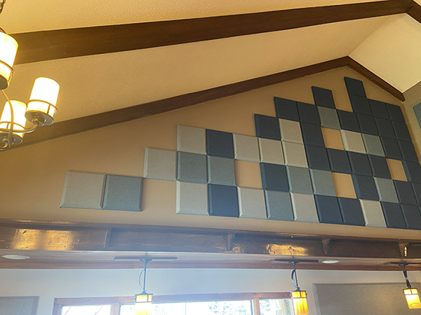 Post 25 wrapped up first, and their design was inspired by their love of legos–they have a display case with some impressive lego creations including some Star Wars figures. After our initial meeting on-site to take measurements and discuss design, we sent them some photos for inspiration that fit well with their lego touches. They picked their favorite, selected a palette of fabric colors that complemented their decor as well as the existing acoustic treatments they had on site. We mocked up their final design with a few shape and color options until they were pleased with a design that work both aesthetically and functionally. The install took a full day, and we came in on a Sunday so as not to disrupt their dining service. They were thrilled with the final result and the sound quality went from a 2 to 10.